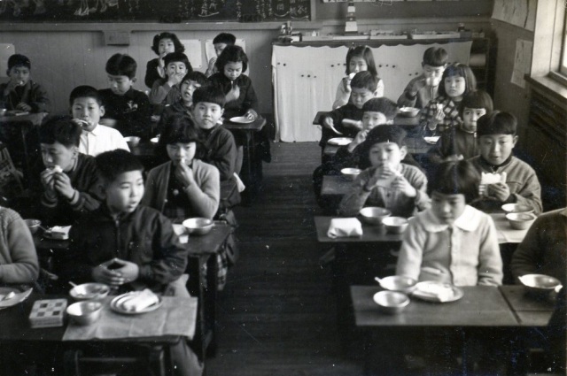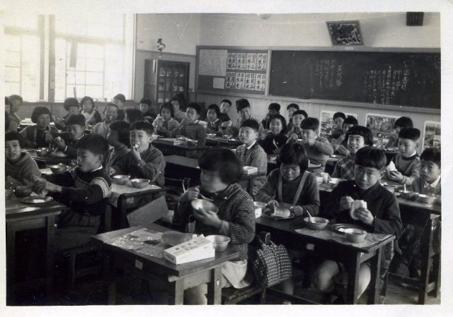 昭和33年頃の給食風景。当時の給食の献立はコッペパン1個と副食(おかず)、脱脂粉乳のミルク、パンにはジャムやマーガリンが付いていた。1.2年生の頃は「肝油」が付いていたように記憶している。この頃の子供にはまだ栄養が足りていなかった子供が多くいたのである。