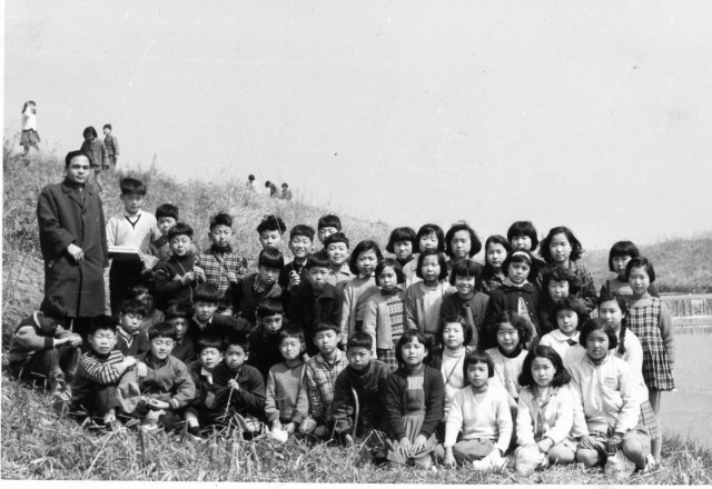 | (写真上)6年4組は吉田先生の担任。最前列右端は船渡先生 |