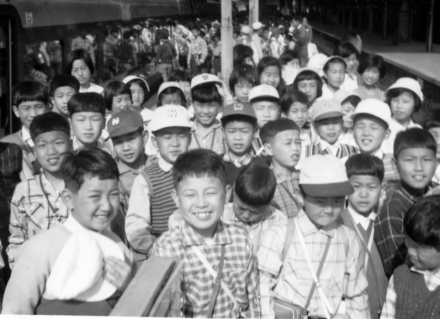 | (写真上)伊勢への修学旅行、近鉄上本町駅ホームに集まる4組の生徒たち。最前列の北川君小畑君の嬉しそうな表情。 |