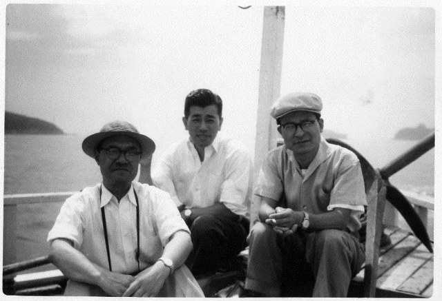 | (写真上)御木本幸吉の像の前で4組の集合写真。 |