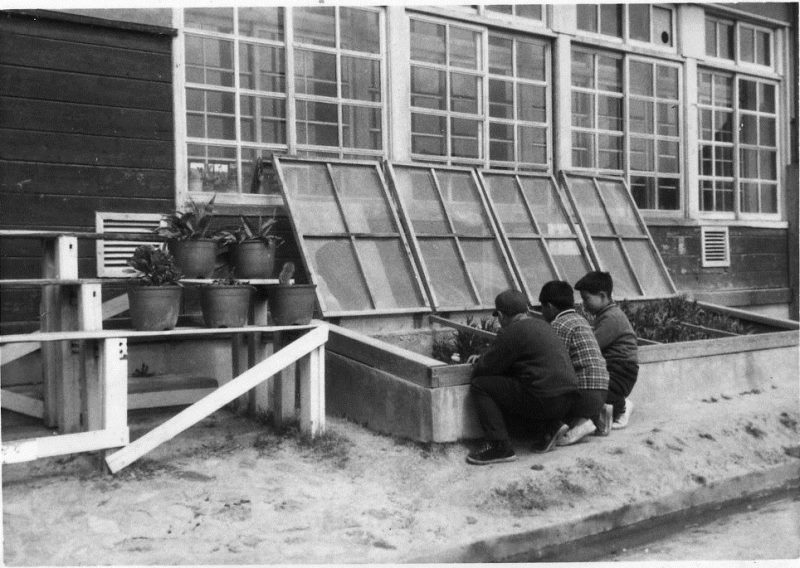 | (写真上)植物栽培用の温床で生育状況を見る。昭和36年3月17日。 |