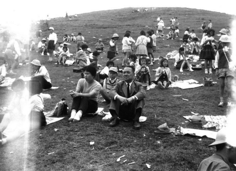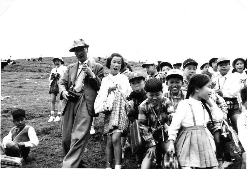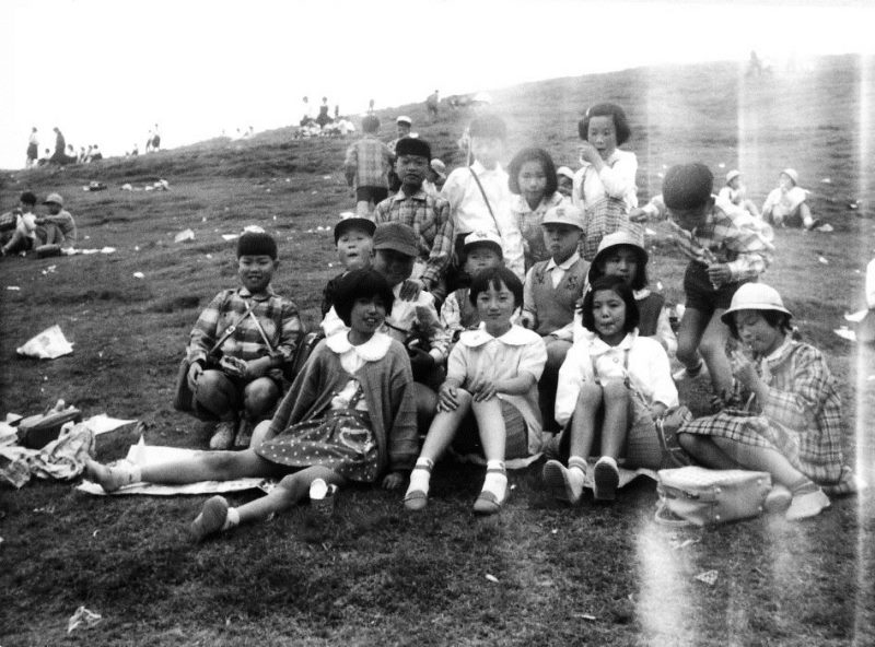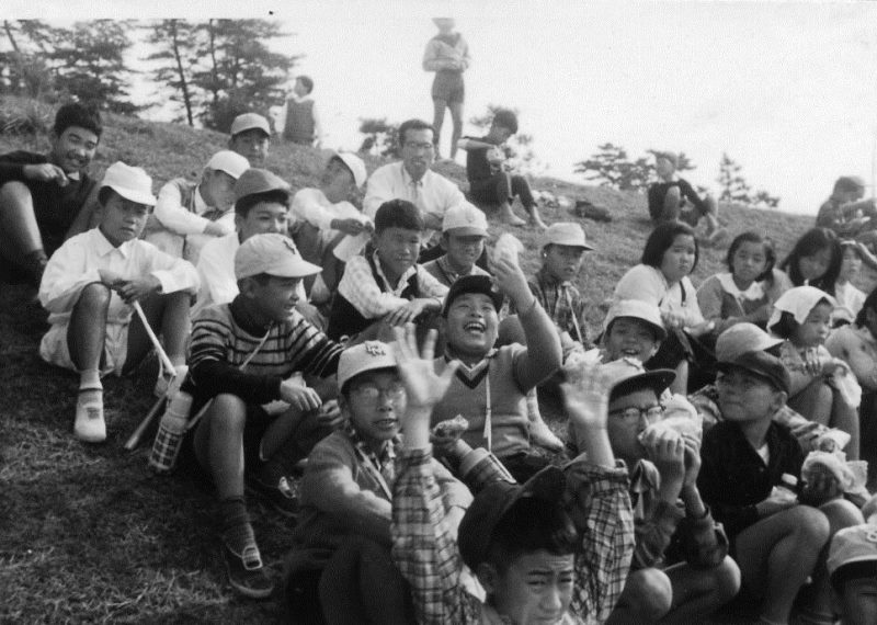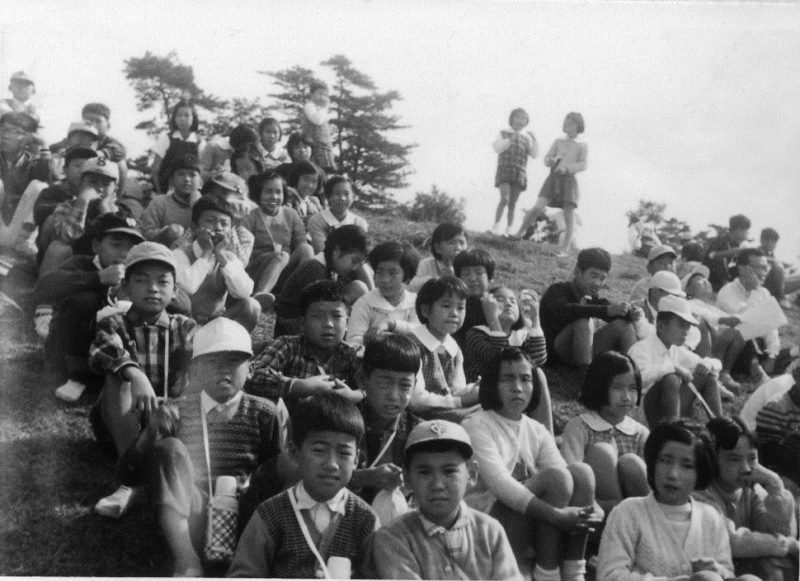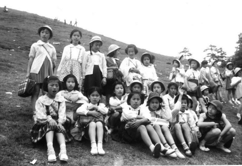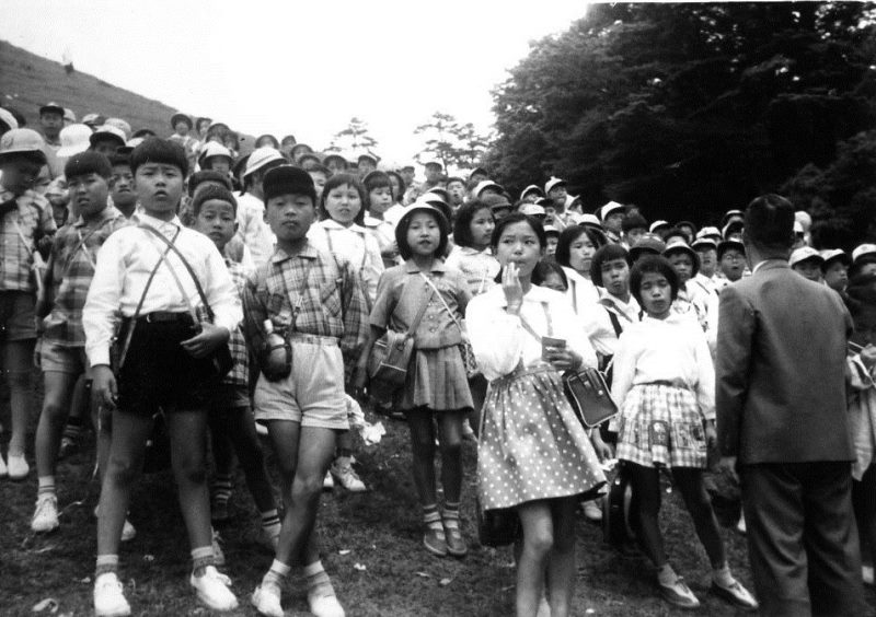 | (写真上)奈良方面への校外学習に若草山で集合した5年生。昭和36年5月18日。 |