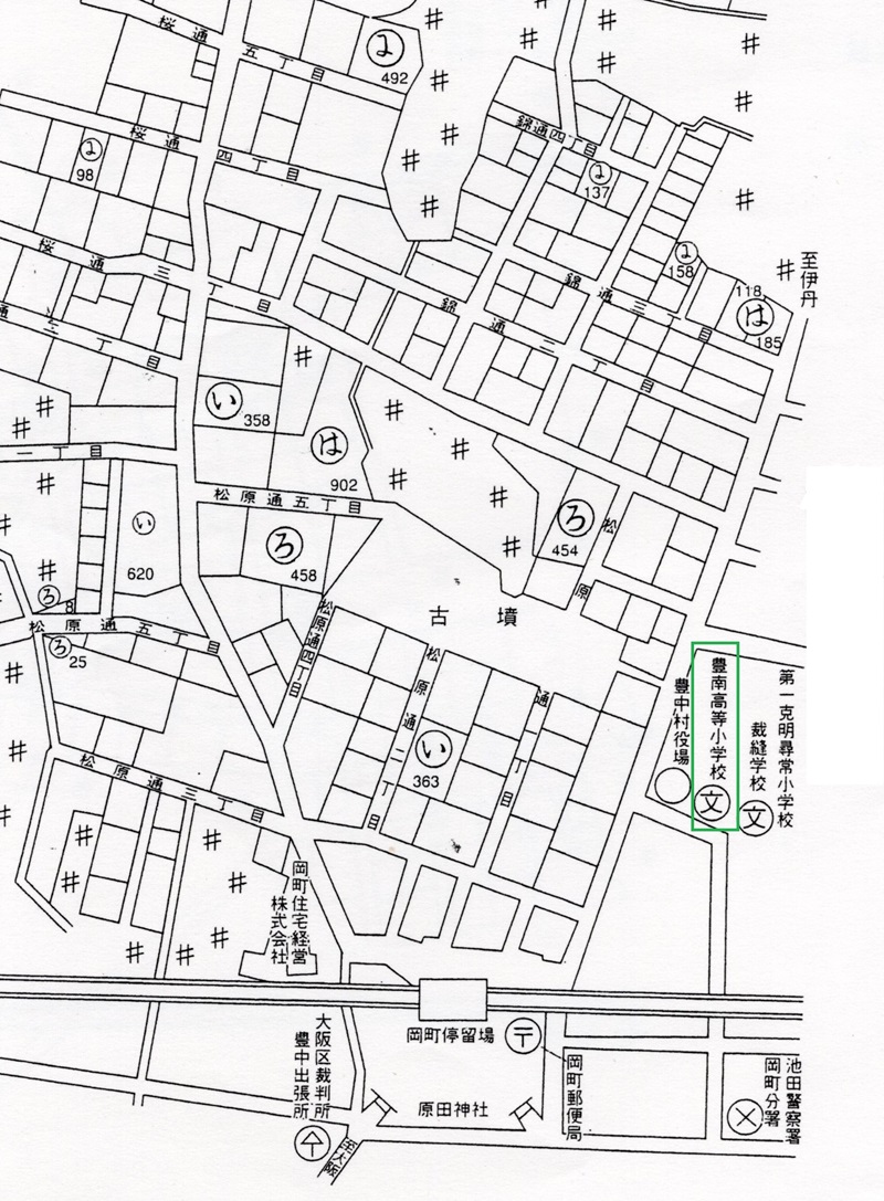 当時の「豊南高等小学校」は現在(2024年)の岡町図書館の場所にありました。裁縫学校も併設されていました。当時は豊能郡豊中村で村役場も同じ地域内に置かれていました。