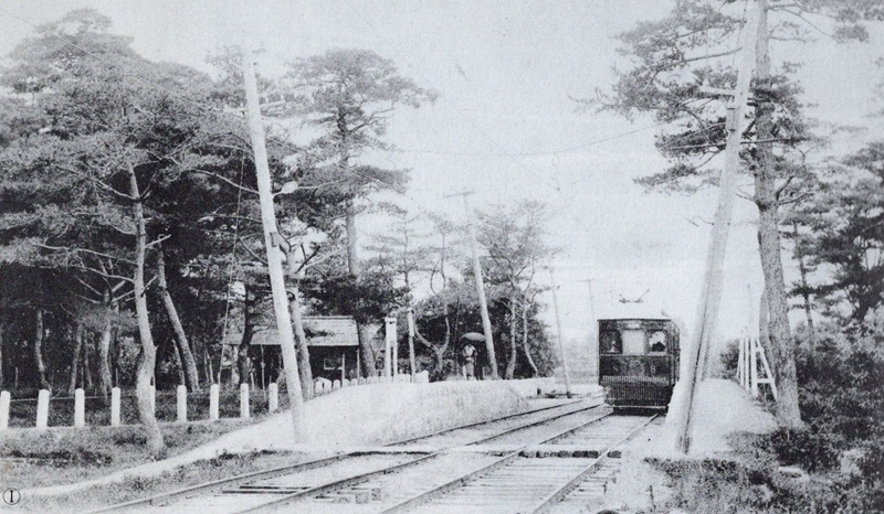 | 開業当時(明治43年)の岡町停留所。当時の原田神社の神苑の中に駅が作られました |