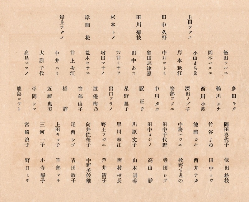 | この時代の卒業生の服装はほとんどが和服に下駄履きですが、数人の詰襟服の生徒もいます。大正から昭和になって時代の変化が感じ取れます。男子は2クラスあって、「孝組」と「忠組」に分けられていました。 |